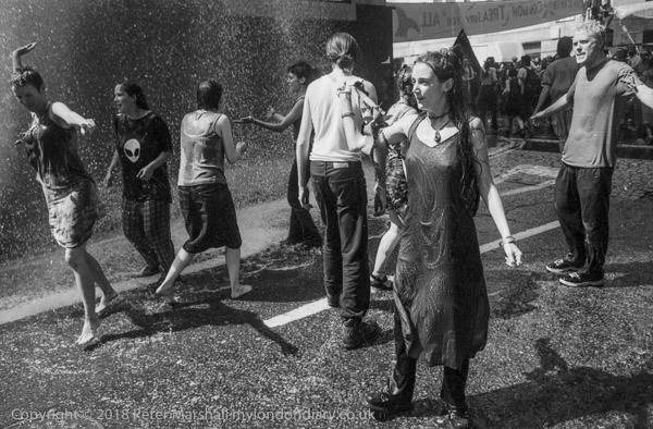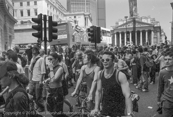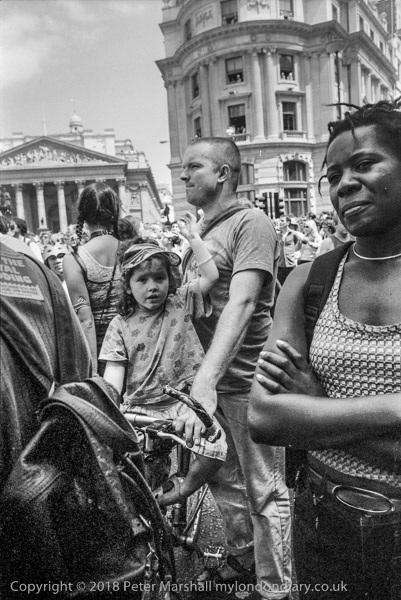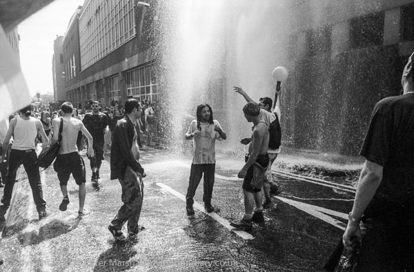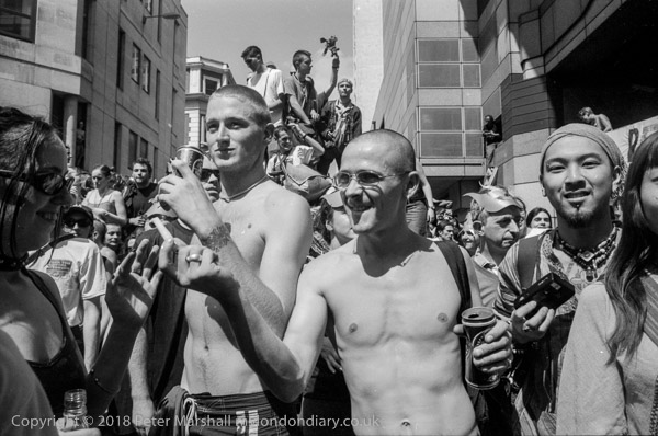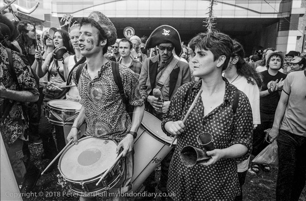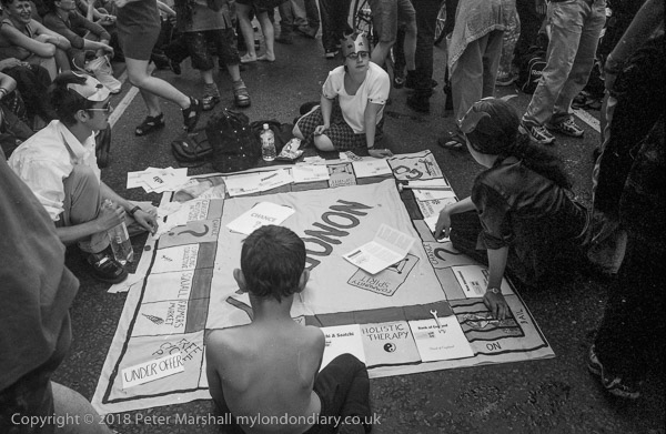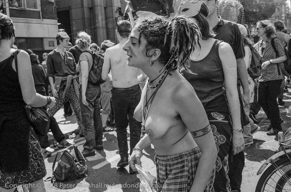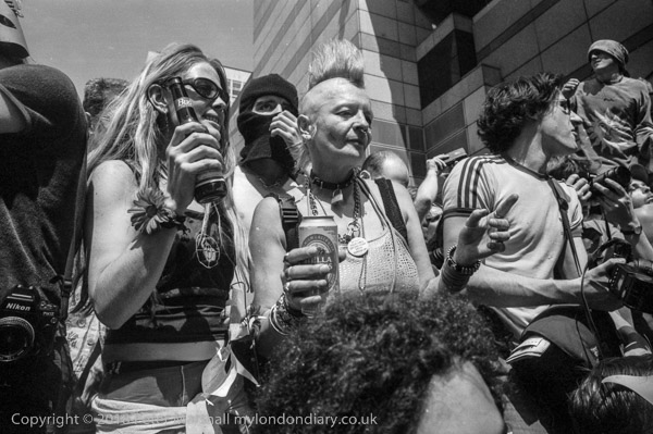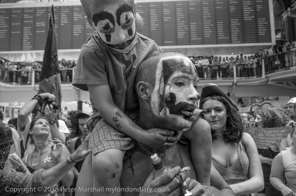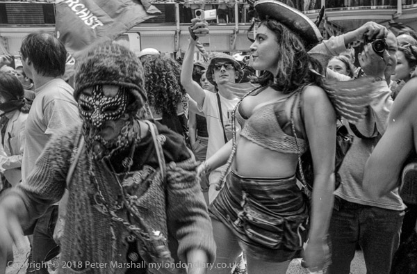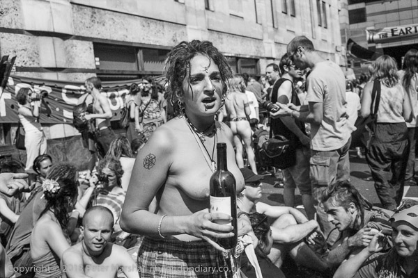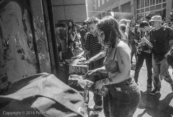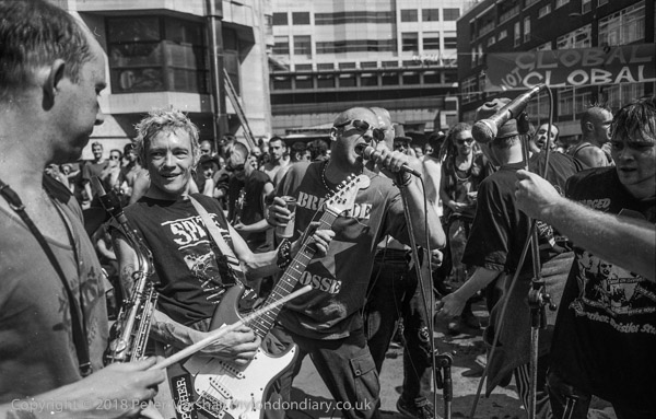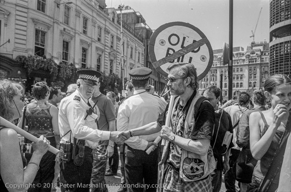 A protester carrying a 'No Old Bill' roadsign shakes hands with a