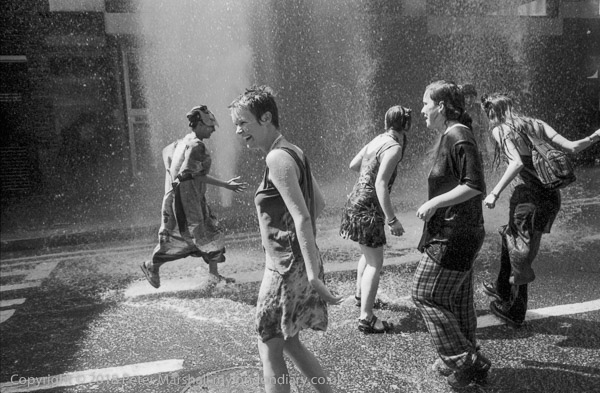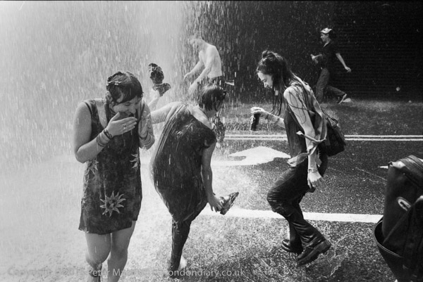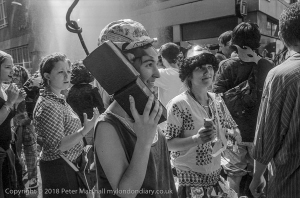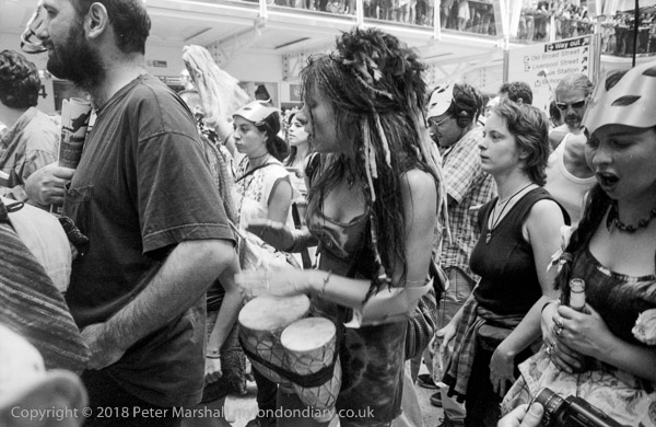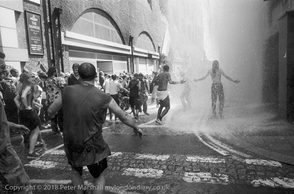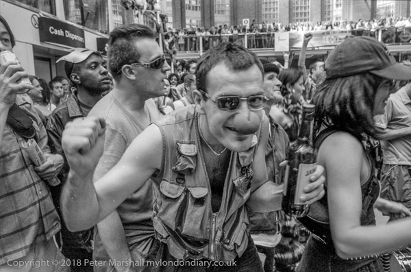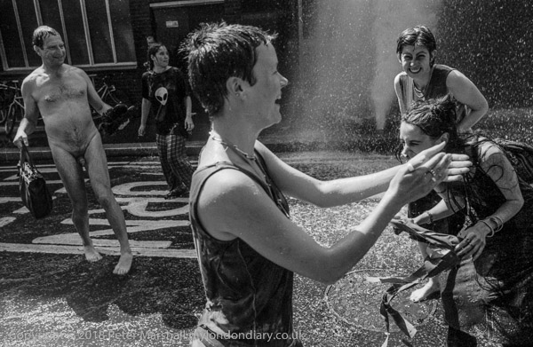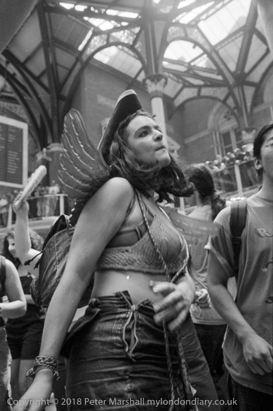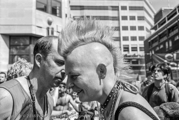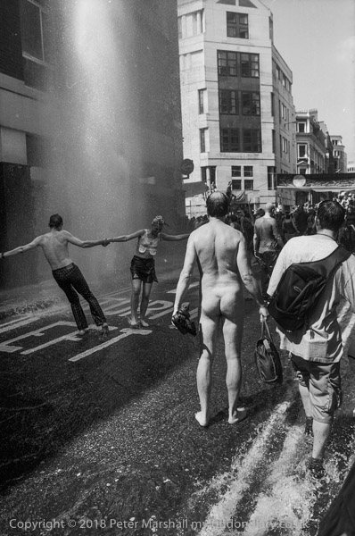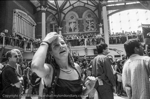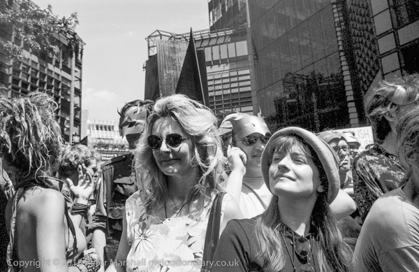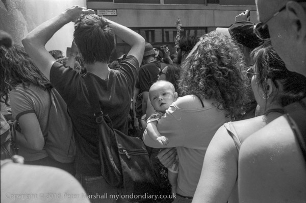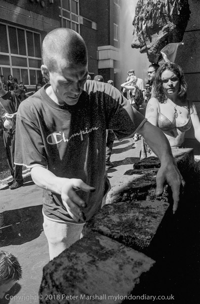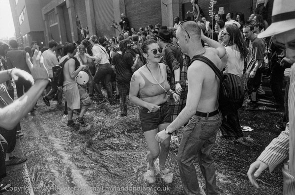 A protester carrying a 'No Old Bill' roadsign shakes hands with a
