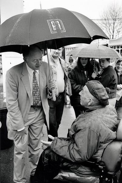 april in london, showers and so an umbrella over ken as he shares a moment with a well-wisher at gabriel's wharf, southwark.