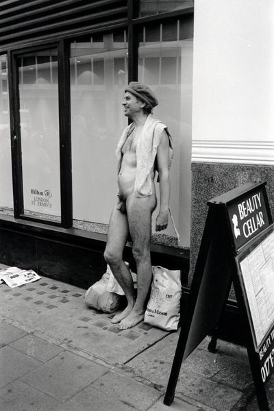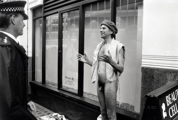 ![]() After a minute or two, police noticed this man and a debate followed, in which it was established that the only part of his anatomy of interest to the police was his penis. He covered it with his hat rather than be arrested. Metropolitan Police, opposite New Scotland Yard, Westminster, London |