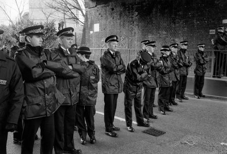 both sides were outnumbered by the police, who managed to corral most of the demonstrators where the march was supposed to start before escorting the front members out a back entrance to South Bermondsey station to start their march.