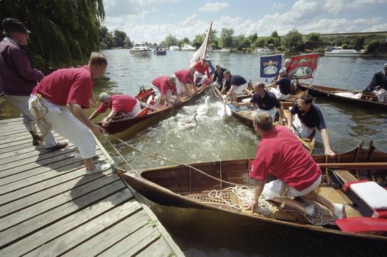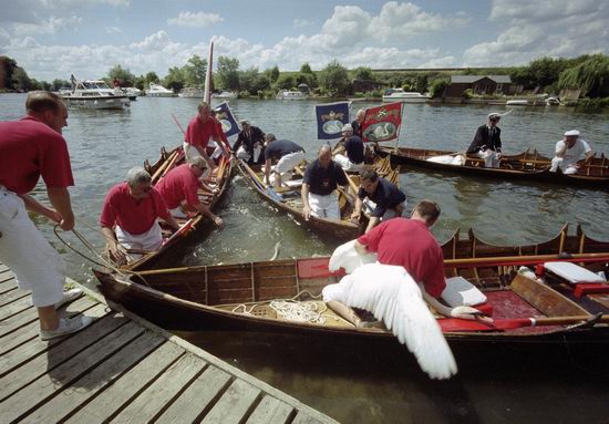 The crown still claims all swans on open water, but only exercises this on the main part of the Thames above London. Two of the London livery companies, the Vintners and the Dyers also have licences on this water, and although the swan is no longer eaten at their feasts, having been ousted in public taste by the considerably uglier turkey. (One Cambridge college, St John's, retains the right to serve swan at its banquets.) | |