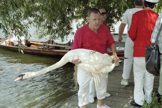 A myth that Richard the Lionheart (Richard I, 1189-1199) had brought the first mute swans back from Cyprus (or Turkey) was used as a justification for these actions. Licence holders were required to identify their swans by special marks cut into their beaks - there were almost a thousand different marks in the sixteenth century. This became done in an annual ceremony known as 'swan upping' which was probably designed mainly to remind the people of the power of the swan owners and the penalties for those who killed swans - up to 1895 you could be sentenced to seven years imprisonment with hard labour, and earlier it had meant transportation and probable death. | |