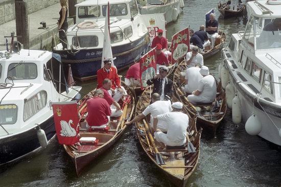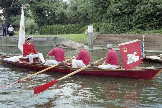 Upping starts on Monday in the third week of July at Sunbury lock. The swan uppers now get towed much of the way along the river by the accompanying motor boats. As well as a small outboard dinghy, a searcher on the bank goes ahead by bicycle on the towpath to scout out swans with cygnets and where possible attracts them to a suitable landing point on the bank. The small flotilla of five skiffs creates an impressive sight in the locks along the way. | |