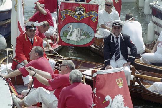 The cygnets are then similarly trussed and laid out for inspection. They are measure, weighed, ringed and entered into the record books as belonging either to Crown, Dyers or Vintners. The adult swans are also given a quick health check and their details noted; they are given an identity ring if they do not already have one. When all the birds have been recorded, the uppers take a bird each, untie the string and release them into the river together. By the time the uppers are back in their boats and casting off, the swan families seem to be going about their normal life as if nothing had happened. |