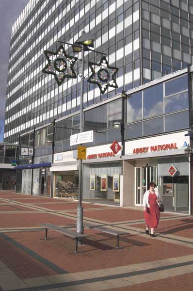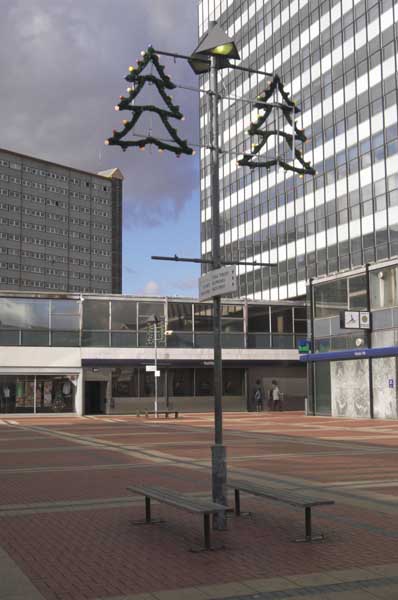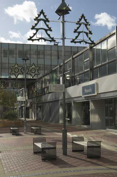 Feltham - the day the Xmas decorations went up. This empty square is the main shopping centre. |