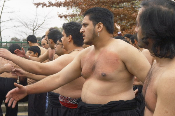 ![]() A literal beating of breasts at the start of the procession, these dedicated men were stripped to the waist. |
