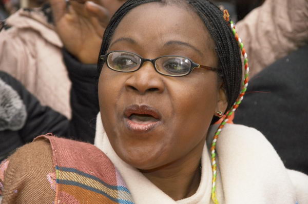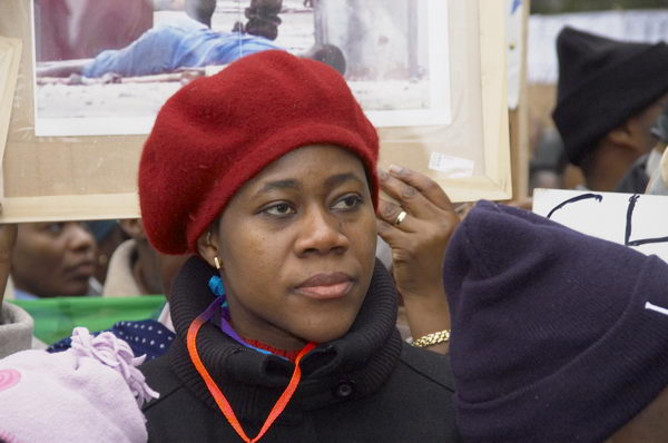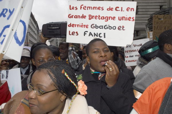 ![]() Woman blows whistle under placard (in French) stating that Ivorian women in the UK are behind Gbagbo and the Government forces |