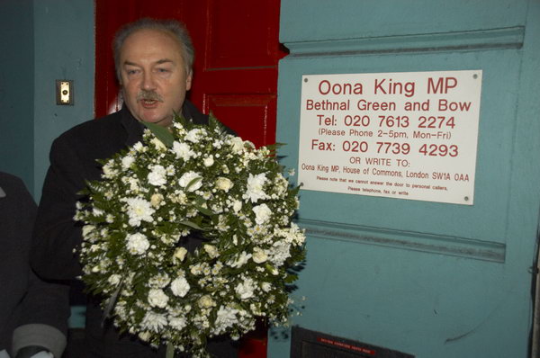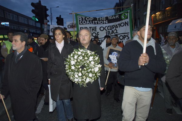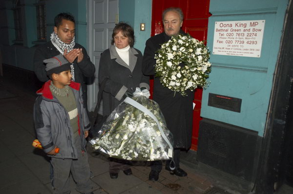 ![]() George Galloway and Lindsey German of 'Stop the War' took flowers to |
