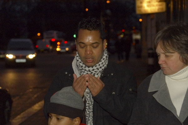 ![]() leave at the door of local MP Oona King on Bethnal Green Road. ![]() After a short ceremony including prayers, the flowers were left, the card on them reading: ![]() "From the people of East London to the People of Iraq. We will always stand by you. Stop the War!" |