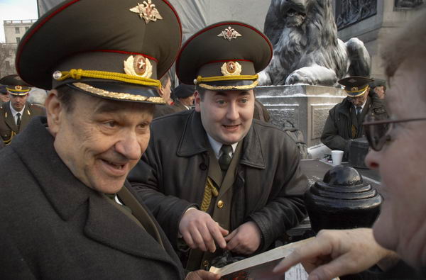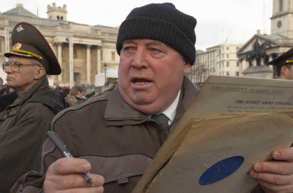 Red Army Choir members talk to Irish fan, Trafalgar Square, London, 15 Jan 2005.