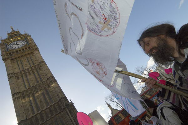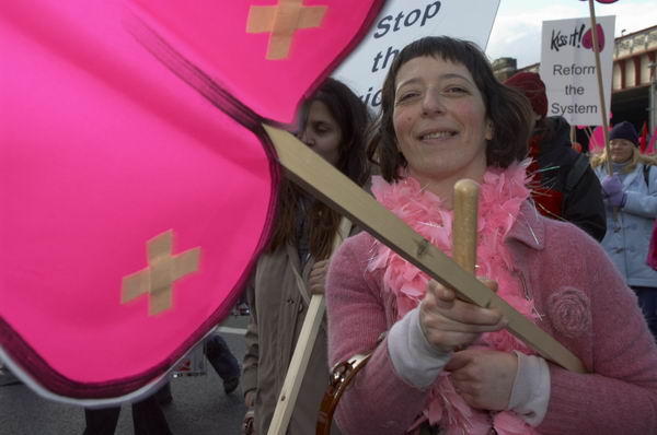 however it was a good day for the kiss-it! XX campaign to stage a march against the inhumanity of forced drug treatment and psychiatric assault. wearing injection plasters making two X's on the seat of their pants they marched first to downing st to hand tony blair a valentine, then past the department of health, the houses of parliament, and st thomas's hospital.
