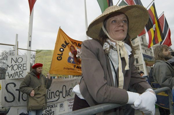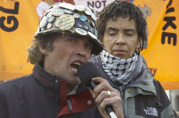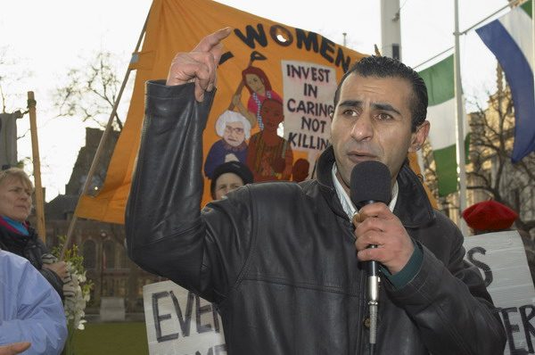 ![]() Brian Haw speaking ![]() An immigrant makes a plea for more humane treatment, in front of the Womens' banner with its message "Invest in Caring not Killing" |