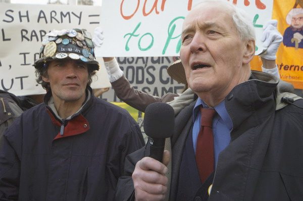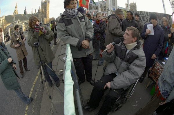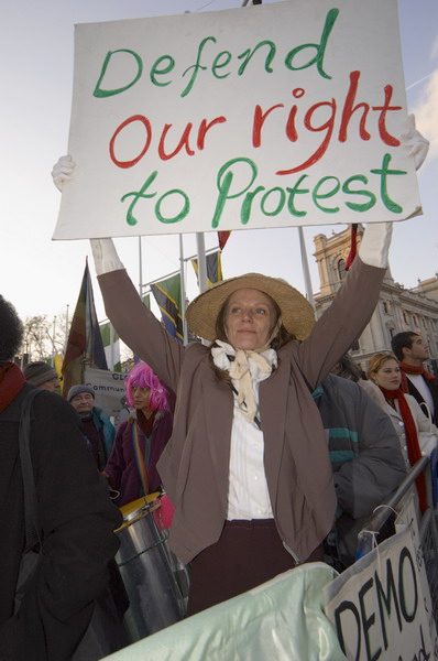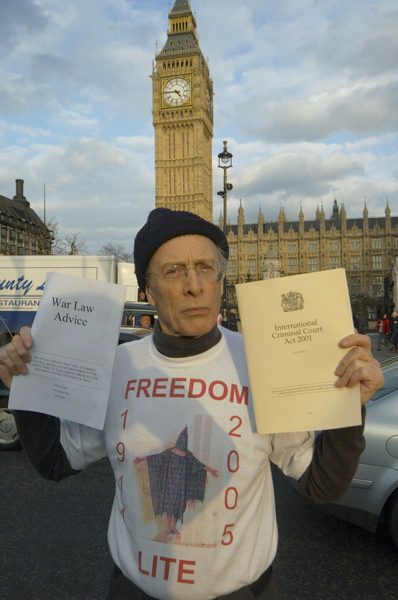 'Defend our Right to Protest' reads the banner she holds aloft. Another demonstrator, wearing a 'Freedom Lite' 'Abu Graib' T-shirt, holds up a copy of the advice given to the Prime Minister on the legality of the Iran war in front of the Houses of Parliament.