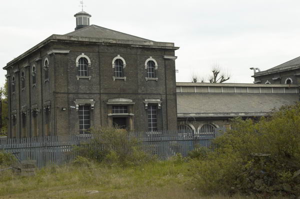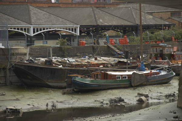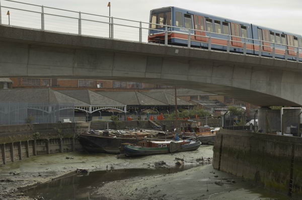 Docklands LIght Railway viaduct and train over Deptford Creek, which takes the Ravensbourne to the Thames