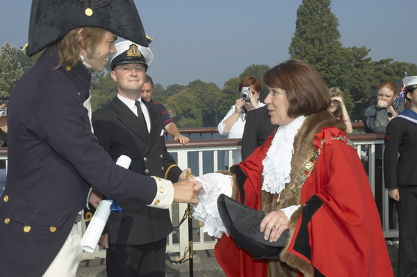 ![]() Lapontiere is greeted by Runnymede mayor, Councillor Frances Barden on Staines Bridge. |