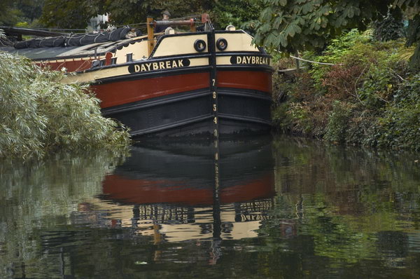 Daybreak, a Hull-registered barge moored by Church Island Staines, next to the Lammas where we listened to the Staines Lammas Brass Band. |