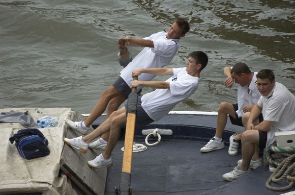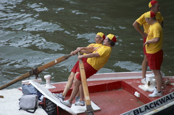 The leading team in the barge race. Rowers use their weight on the oars, with 2 pairs taking turns. |
