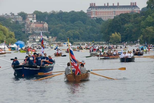 the great river race isn't really a particularly great race, but there were well over 200 boats involved, and considerable competition. the event is a handicap, and also has multiple classes and boats start at different times - some over an hour before the fastest - but should all arrive at island gardens at around the same time. the boats include some of historical interest as well as those built entirely for speed.