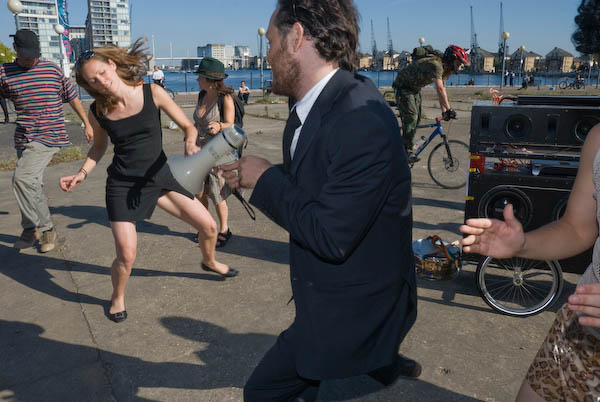 i was slowly making my way around the the tidal dock basin road which leads to the main vehicle entrance to excel. the space hijackers had announced they would be bringing a tank to the fair, and this seemed to be the likely route they would take.