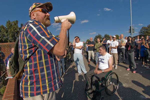unfortunately the police set up a long thin pen along the side of the road opposite the station, and would not allow speakers to use the small cycle-towed sound system. so the demonstrators were too spread out for many to hear the speeches, by local residents len aldis and bill perry, local councillor alan craig, green party mayoral candidate sian berry, caat's ian prichard and comedian mark thomas.