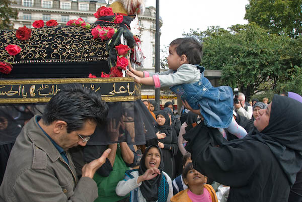 shia muslims regard ali as second in importance only to muhammad. their commemoration at marble arch started with a long period of mourning, before a coffin was brought out and people crowded round to touch it.