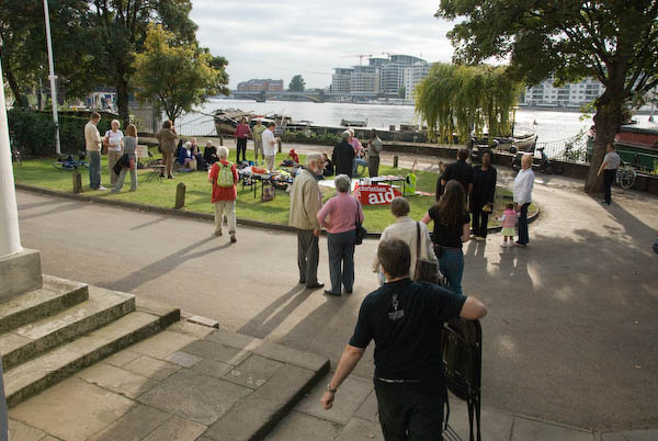 the marchers arrived at st mary's church in battersea on sunday just a few minutes before me, for a picnic with supporters, after which they were going to speak during evening services there and in putney and chelsea.