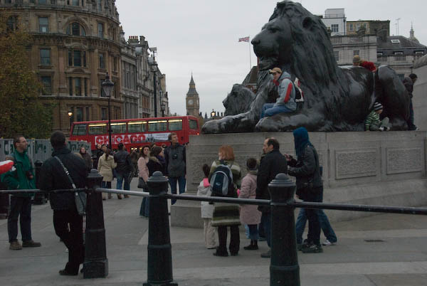 Kids posing for photographs at the International Brigade monument in Jubilee Gardens |
