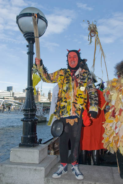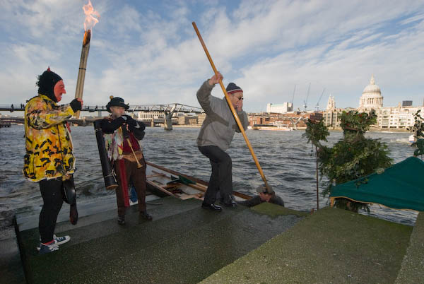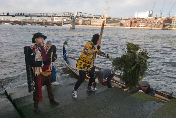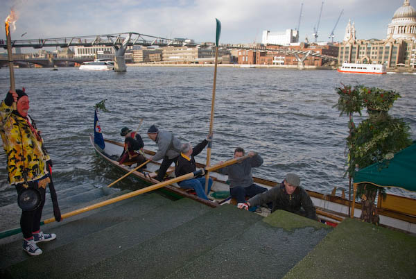 The Thames Cutter, Master Shipbroker, brings the Hollyman and bagpiper under the Millennium Bridge
