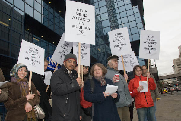 Around 30 people turned up on Thursday for a lunchtime picket outside the Daily Express offices in the Northern and Shell Building (a rather odd large blue modern block next to Billingsgate in Lower Thames St) for a protest organised by the Stop the War Coalition along with Media Workers Against the War, the Muslim Activists Network of Stop the War and the British Muslim Initiative.