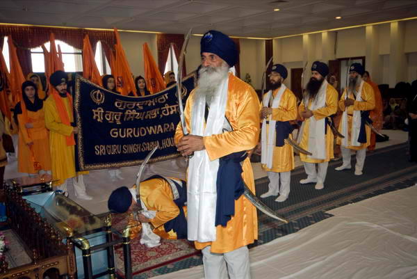 The procession was led by the Nagara, a large drum beaten with considerable force (originally used to celebrate victory in battles) which was followed by the Gurdwara banner. There were two rows of Sikh women carrying Sikh flags (saffron with the Sikh Khanda symbol, followed by 5 Sikh men with flags and then the Panj Pyaras (the five beloved ones) with their swords held upright, walking directly in front of the lorry carrying the Guru Granth Sahib.