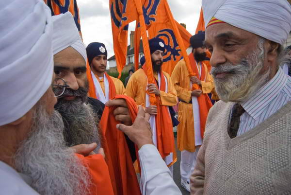 Here orange sashes were presented and put around the head of the Sikhs carrying the flags, the Panj Piaras and some of the others taking part.
