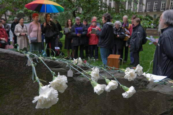 The fountain in Russell Square could have been designed with them in mind, with a strongly phallic character in the water jets, which in normal use rise and fall, but were left to flow at full strength for most of the ceremony. At first the group danced around the fountain in rings with hands joined, but then many of them started to run through the centre, many getting soaked. Even the drummers, who at first stood on the edge providing a rhythm for the dance, eventually ran though the jets, and finally the Green Man also did so.