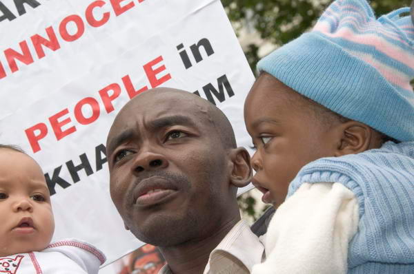 Demonstrators also carried placards asking for other Sudanese war criminals to be brought to justice, including Saleh Gosh, head of Sudan’s National Security and Intelligence Service, Sudan President Omar Al Bashir, the Minister of the Federation Government Nafi Ali Nafi and former Foreign Minister Mustafa Osman, who were all among the 52 listed for investigation by the UN Commission of Inquiry into war crimes in 2005.