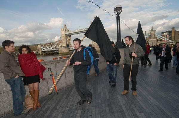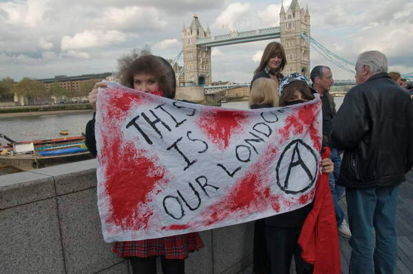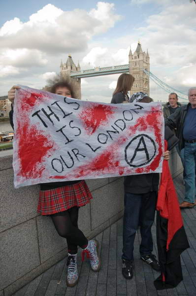 ![]() The first anarchist banner was held up outside City Hall at 18.19 by two young anarchists, stating 'THIS IS OUR LONDON'. |