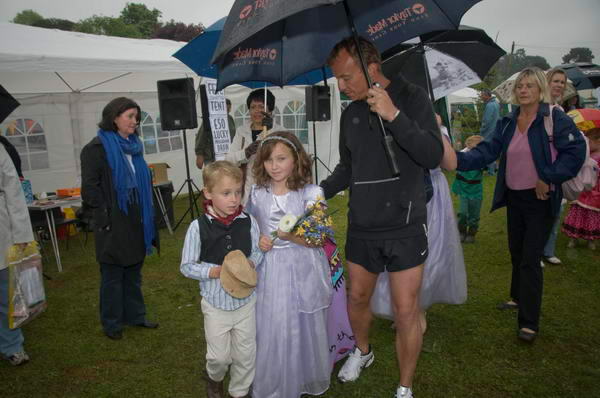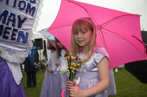 Spots of rain blur parts of the image of Miss Bromley and her senior princesses arrive at the Fete ground