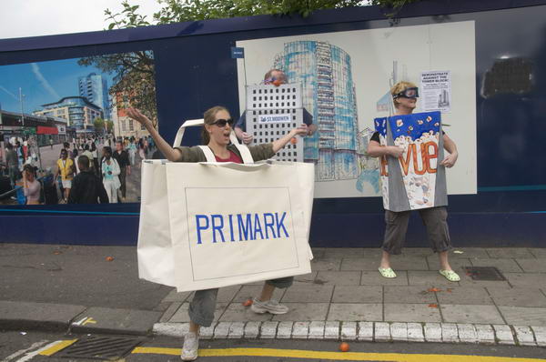Around 12.30 the crowd of about a hundred people walked from Town Square (a regenerated area that already seems to need some regeneration) across to the Arcade site and the fun began. Market traders had donated several boxes of very ripe tomatoes and kids and adults enjoyed the forceful gesture of throwing these at 'Tower Block', 'Vue' and 'Primark' to robustly demonstrate their opinion of the St Modwen proposals. It was a short but rather messy protest - and one that made the TV London news in the evening.