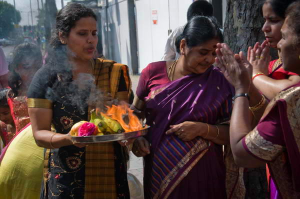 The procession was led by musicians, and by women carrying pots of burning embers on their heads and in their arms. As the chariot made its way along the street, people brought offerings of good to be blessed, and these were returned to them flaming.