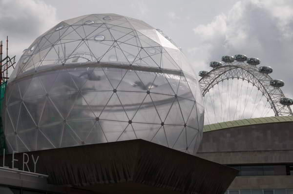 From there a bus took me over Waterloo Bridge to the National Theatre, where there was an interesting display of the 'Pitman Painters', notably Oliver Kilbourn, work that came from a WEA class started in Ashington in the 1930s and continued until the rent on their shed got put up in the 1980s. Outside were giant photographs from high places in London, part of a display for the London Architecture festival, but what interested me most was the views from the terrace, particularly with the addition of a giant sphere for the current Hayward show. The photos were also interesting in their way.