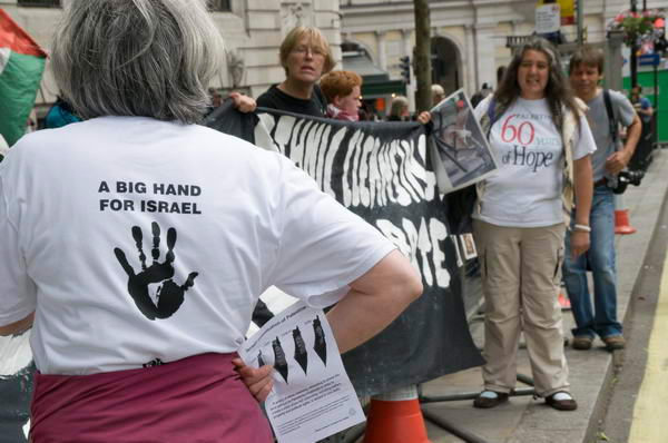 As the parade came into Trafalgar Square it passed by a group of people with the banner 'Remembrance - Zochrot'. This Israeli Jewish organisation was founded in 2002 to educated Israeli Jews about the catastrophe (al-Nakba) for the Palestinians of 1947-8, when over 400 Palestinian villages were destroyed. They held placards with the names of the villages and stood largely in silence as the parade passed by. While I watched several people left the parade to harangue them and wave Israeli flags in their faces.