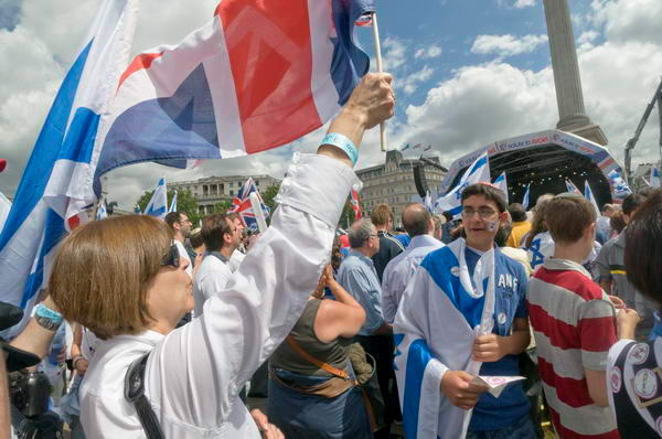 It left a nasty taste as I went to photograph the people celebrating in Trafalgar Square. Later I photographed another group protesting on the side of the square pointing out that for Palestinians the sixty years had meant an increasing loss of their land through both military actions and settlements, as well as a loss in liberty. The police had kept them well apart from the celebrations, across the road in a pen in font of South Africa House. When some pro-Palestine demonstrators put their banner on the walls overlooking the square they were rapidly surrounded by Jewish security guards, who then called the police. They were then told they could protest with the other demonstrators across the road - but if they continued to do so on this side would be arrested. Given the circumstances, the police policy of separating the two groups seemed rather sensible.