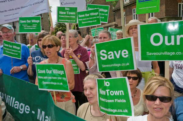 Demonstrators from eight of the 15 sites short-listed for eco-towns came to demonstrate and lobby Parliament today, the last day of the government consultation over the sites identified for the 10 developments. The protest groups came from Curborough (Staffs), Elsenham (Essex), Ford (West Sussex), Hanley Grange (Cambridgeshire), Marston Vale (Bedfordshire), Middle Quinton (Warwickshire), Pennbury (Leicestershire) and Weston Otmoor (Oxfordshire.)
