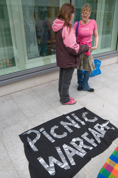 ![]() Police and Security man read the leaflet while protesters get the picnic ready |