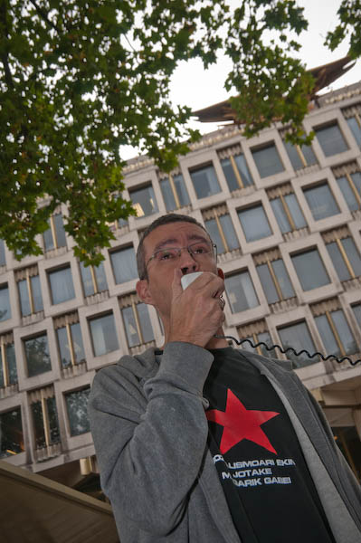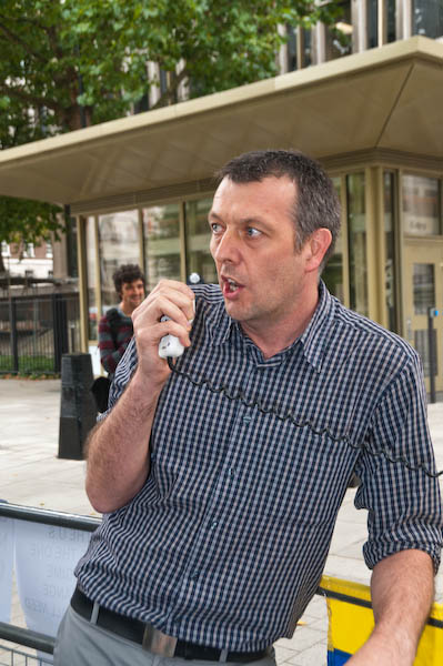 ![]() Jeremy Dear speaks. Behind him two supporters, one with a Venezualean flag, and watching in front of the US Embassy and armed policeman |