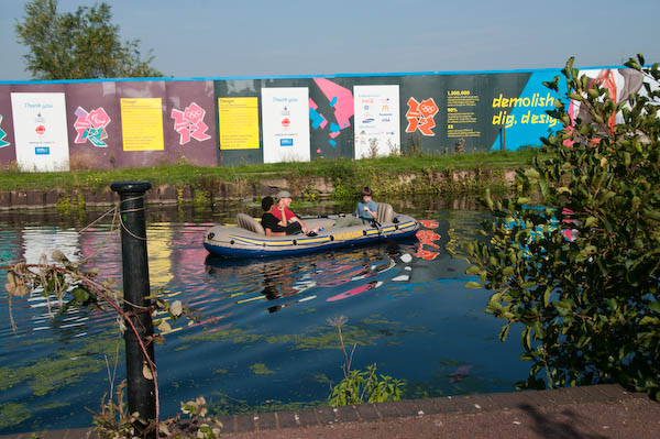 ![]() Leabank Square has its own wharf area - here selling secondhand books - opposite the decorated blue fence of the Olympic construction area |