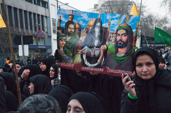 Ashura is a major religious festival for Shia Muslims, who mourn the martyrdom of Imam Hussain, the grandson of the Prophet Muhammed, at the battle of Karbala in 61 AH (680 AD.) The procession in London is a part of the commemoration and mourners, largely dressed in black, walk along accompanied by the beating of drums and the wailing of horns, with a rhythmic ritual beating of their chests and chanting "Ya Hussain".