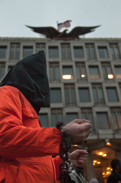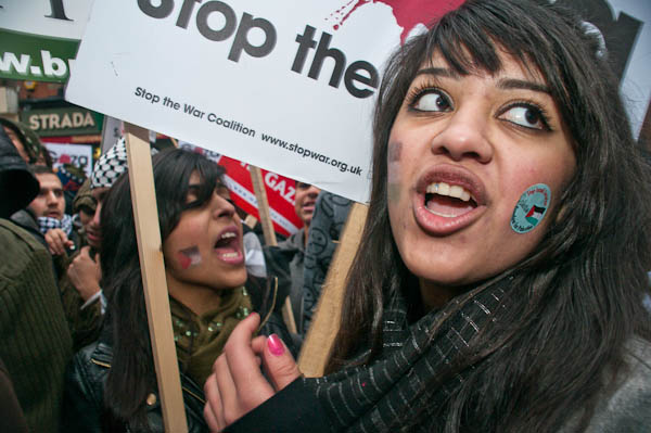By this time the march was led by several hundred mainly young protesters who were already clustering in front of the road leading to the embassy by the time the line of celebrities at the official front arrived and paused for a few minutes. I had no problems with the police during the event, but at this point I was assaulted by several Stop the War stewards, some of whom do seem to have a real problem with the press. They pushed me around and tried to stop me from working, although other stewards who who saw what happened did apologise to me for the treatment I received.
