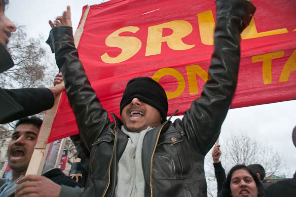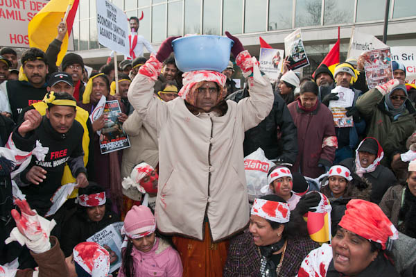 The Tamils were there to draw attention to the continuing attacks on Tamil civilians, schools, hospitals and churches by the Sri Lankan Army and Air Force and to call for an independent Tamil state, Tamil Eelam, in Sri Lanka. They accuse the Sri Lankan government of genocide, and claim that in the past month alone over 300,000 Tamils have been forced to move out of their homes by the bombardment.