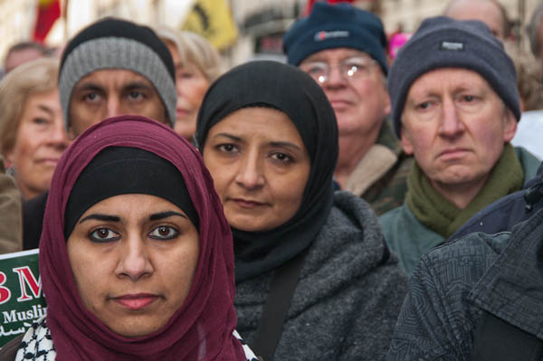 Perhaps 2-3,000 almost entirely Muslim men and women then marched down Park Lane led by men carrying posters against the occupation of Palestine, Iraq and Afghanistan and an end of support for 'Arab puppet tyrants.' Behind these, men carried 3 black 'coffins', all with the message 'Killed in Gaza' on one side. On the other, one had 'Killed by Mubarak', the second 'Killed by King Abdullah' and the third, 'Killed by Assad.' Most women marched in a separate block led by female stewards in the centre of the demonstration.