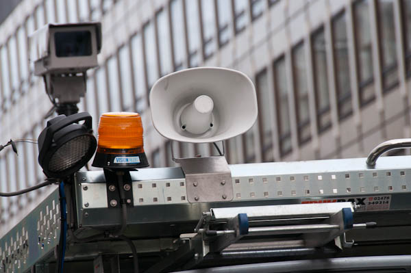 Camera on surveillance vehicle in front of the marchers